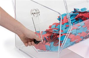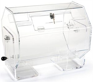 These raffle ticket tumblers are rotating raffle drums that serve as a collection container for tickets, sweepstakes entries, and ballots. A medium sized raffle drum such as this spinning raffle box is the perfect size for tables at tradeshows or in the office for drawings.