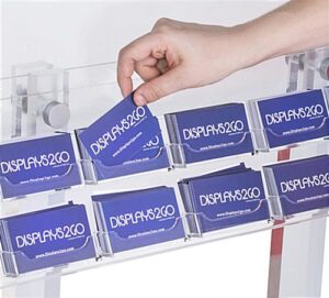Get your company name out there with this acrylic poster stand with business card holders! The clear double sided sign frame effectively displays your advertising in a 22” x 28” frame. Graphics are easy to insert and replace with the side loading design built into the floor standing poster stand so you can stay up to date with promotions and information. After the large sign attracts your potential customers, the open rack pockets allows passerby’s to grab your contact information, keeping the connection going after they walk away. With 20 compartments split evenly on each of the double sided sign frame, you can place your displays in a busy area, such as a lobby or hallway, to reach your audience effectively. Each clear rack offers a unobstrusive view with an angled design, helping to guarantee that anyone who views this poster stand can see and grab your contact information without any hassle.