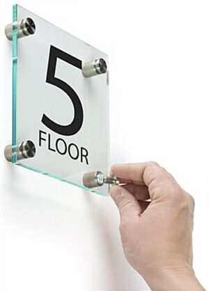 These floor-level signage displays will add an elevated professional aesthetic to your bank or corporate office. The identification signs include steel standoffs that affix to the wall and faceplate for a sleek modern appearance. The level signage displays for doors and hallways are beautiful and offer a green hue on the edges to give off a glass-like presentation. The signage provides bold lettering and numbers that are perfect for marking exit doors, elevators, or waiting areas.This signage offers a clean, modern design perfect for adding style and sophistication to your business.