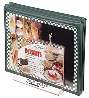 Share your brand with guests using this customized tabletop menu holder rack. Featuring your custom logo on the base of the sign display is the perfect way to promote your brand. The double-sided menu holder rack includes a middle area for storing specials or drink lists. Place this sign holder on tables or bars to maximize eating space for customers thanks to the small footprint. Add a personalized touch to any establishment by creating a custom logo printed on the base in full color. The 7” x 5” display area of this menu holder rack provides additional room for bar promotions or cuisine specials.