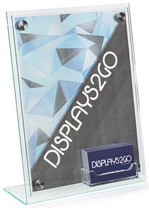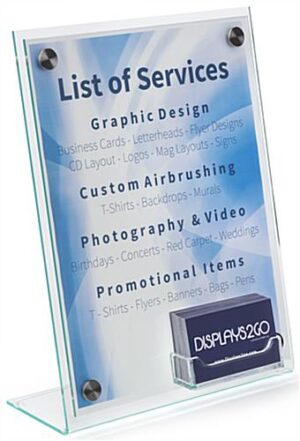 This high end business card sign holder is an acrylic literature display for countertops that holds 8.5” x 11” standard size paper. Quality made with green edge plastic and stainless steel silver binding screws, the kit also includes 3 sheets each of clear and frosted film with cutouts so printing at home is easy! Design your advertisement, print it on to one of sheets, load the poster into the front of the acrylic sign holder, and bind it together with the standoffs for a professional look. Provide customers with a takeaway inside the 1” thick contact information slot so they can follow up with your company. The slant back countertop design provides a higher level of visibility for the sign holder to passersby. This clear acrylic literature frame is a quality product for offices, corporations, and other commercial spaces.