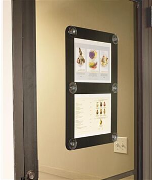 These acrylic signs are perfect for advertising special promotions, new menus or other important information, as a result of their neutral design. These plastic frames feature a bold black border, ensuring your advertisements will be noticed. These acrylic signs, also known as window signage displays, hold (4) 11″ x 8-1/2″ prints, two on either side, to reach a broader audience and to display more than one advertisement at a time. These plastic door frames also permit fast and easy graphic changes. Printed advertisements can be changed by simply unscrewing the decorative screw caps, and separating the two acrylic panels. Acrylic signs, such as these window display frames, are an effective means of communicating with visitors, even after business hours.