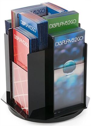 Literature Holder – A Top Seller!! This compact designed literature holder is fabricated with polished black and clear Plexiglas. This display has 8 Pockets that measure 4″ wide x 1″ deep, designed to display your 4″ wide x 9″ high literature. The total footprint is 10-1/2″ diameter by 10″ high overall. This literature holder is a great countertop display. The clear acrylic front gives a full view of your front brochures. Organize your work area or advertise your company’s literature with this contemporary designed rotating literature holder.