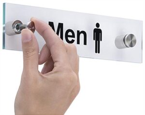 This “men” bathroom sign features a sleek green tint around the acrylic border to integrate perfectly with your existing décor. The public toilet display includes a set of silver steel standoffs to affix the unit on the wall or door. When mounted, the clear bathroom sign stands out 0.75” from the wall for a low profile look. The unit measures 8”w x 2”h overall for a clean presentation fixture. Add a bathroom sign to your retail store or business office to designate the public toilet area. This display with a clear design will coordinate well with any décor or in various settings.