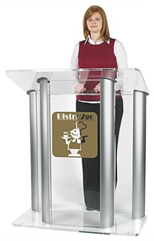Featuring an extra-large reading surface, this wide lecture stand with custom panel is the perfect acrylic podium for your next presentation. The floor standing product has aluminum side extrusions giving it an attractive style and sturdy build. The lecture stand for business use allows you to add a 14” x 14” logo to market your corporation. This product measures a height of 51”, providing you complete control of the room and commands attention when speaking at presentations. Adding the stand to a church, business, or hall will increase marketability and notoriety with your company’s trademark emblem. Promote your business with this acrylic podium at your next convention or in a meeting room and represent your company’s business model!