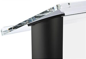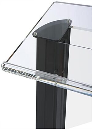 This clear & black podium is best used in a conference hall, church or university to hold reminder lists and notes while speaking to a crowd. The lectern totes an acrylic front panel, as well as a 26.75″ x 15.25″ reading surface to help keep all of your presentation materials in order. This contemporary black podium features a 2-color customization option. The 2-color vinyl imprint measures 14” x 14” and is printed on the acrylic front panel. The bottom features 4 rubber feet on the base that are best used to prevent damage to any floors or the bottom of the lectern itself. The aluminum extrusions on the sides of the podium help to provide the modern look you are seeking. If you are worried about a difficult set-up, there’s no need because this lectern will be shipped to you fully assembled and ready for immediate use to hold your reminder lists when engaging the crowd.