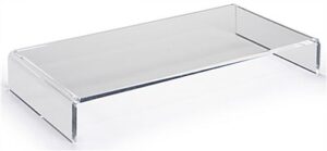 This acrylic monitor stand features a classic waterfall design manufactured from hand-bent clear plexiglass. Mix up your office computer with this modern fixture that complements any environment. Organize and conserve workspaces with this desktop monitor stand that has keyboard storage underneath when not in use. Reduce neck and eye strain by raising your computer on the clear riser for a more ergonomic and safe work day. With sturdy plexiglass construction, this monitor stand supports screens up to 31 pounds. Great for use at home or in the office, this desktop riser with keyboard storage provides function to your workspace and helps workdays run more smoothly.