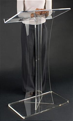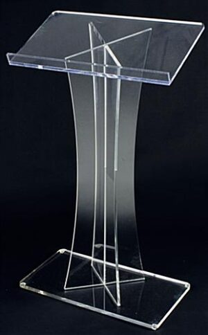 This floor lectern has a unique “X” design. This design provides a more contemporary floor lectern, while still being traditional enough to fit in with a variety of locations. This floor lectern has a base made of 3/4″ thick acrylic providing a sturdy display to present from. This unique full podium, floor lectern is a full size pulpit, standing 46-1/2″ high. A floor lectern, also known as a pulpit and an acrylic display, has (4) rubber feet under the base to keep the lectern from sliding. This floor lectern has a unique design, drawing all attention towards an orator, no matter what the location is.