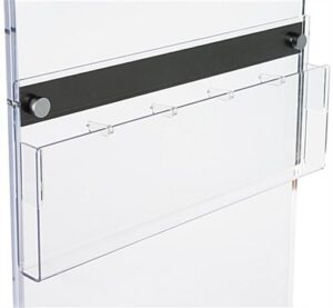 Use this brochure holder for FSPH poster stand series to expand your literature material storage space. Compatible with the clear acrylic sign frame, the silver standoffs from the complete unit is used to secure the add-on in place. Removable pocket dividers allow for more versatility and freedom with your material sizes. Clear construction provides a full view of the handouts placed within the 5 slots.