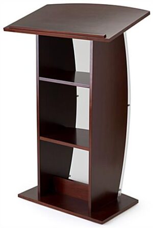 Whether you’re looking to update or expand your church furniture, this curved acrylic mahogany pulpit is an affordable and classy option. Each floor standing lectern includes a clear panel on the front of your display for unobstructed viewing. This wood veneer finished acrylic mahogany pulpit ships fully assembled making this podium a convenient choice. Rubber feet are included with the floor standing lectern to prevent scratching. With its built-in wood shelves, this podium is a great tool for your next event. The modern design makes this mahogany pulpit a perfect complement for your existing church furniture or even for use at conferences or other presentations.